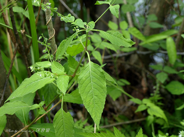 잎은 대생하고 마디 사이의 밑부분이 다소 굵으며 홍자색이 돌고 넓은 피침형이며 밑부분이 예저 또는 원저이고