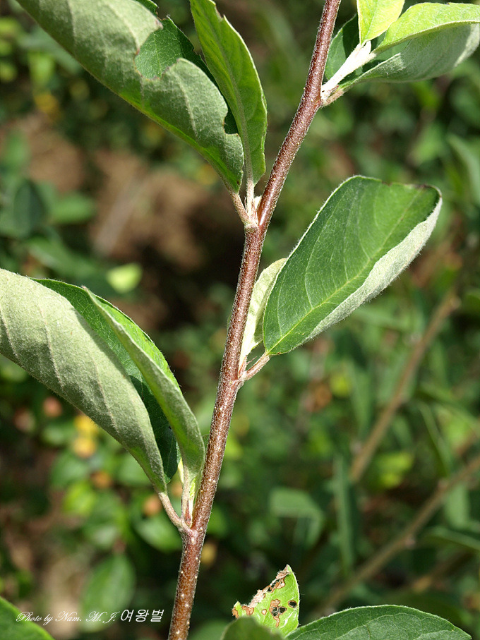 어린 가지는 자색을 띠고 털이 덮여 있다. 수피는 잿빛이 도는 자주색이며 어린 가지에 털이 있다.