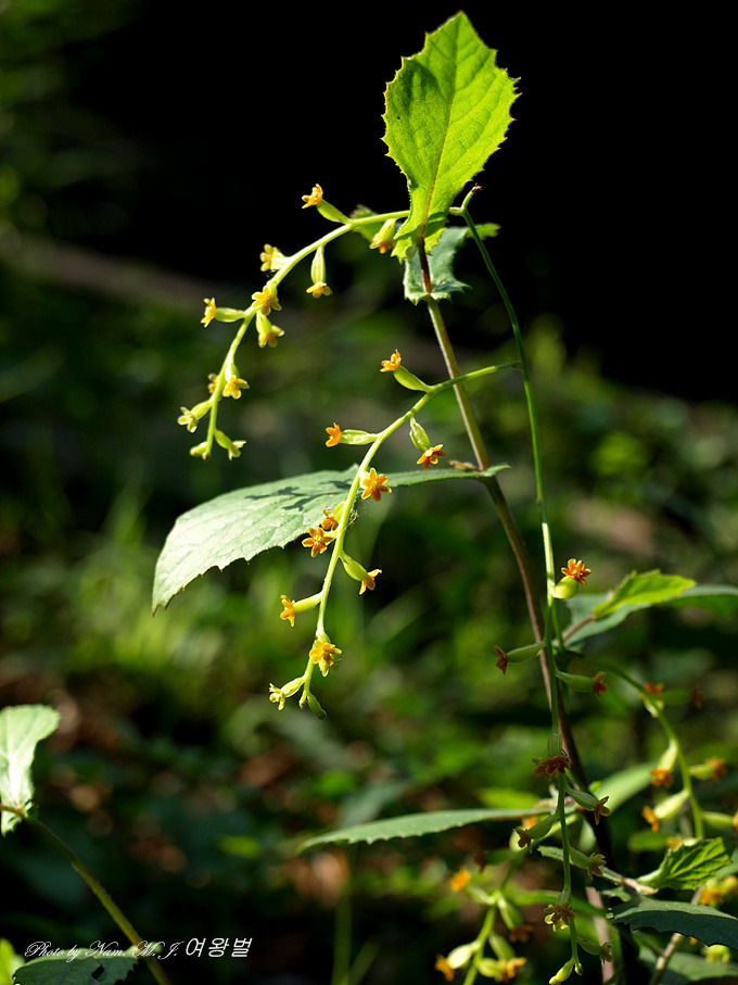 엽액에서 화수가 자라고 소화가 많이 달리며 화수는 길이 5-15㎝이고 꽃덮이조각은 6개이고 수평으로 퍼지며 황록색이다.