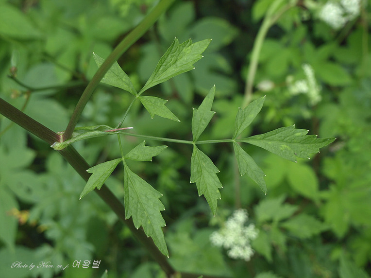 근생엽은 엽병이 길고 경생엽은 호생하며 2-3회 3출우상복엽으로 길이 10-40cm이고 처음에는 땅에 벌어지나 자라나서 개화하면 말라죽는다. 소엽은 난형이고 가장자리에 거치가 있으며 끝이 뾰족하고 간혹 2-3개로 깊게 갈라지며 윗부분의 잎은 작아지고 퇴화되며 엽병이 초상으로 된다.