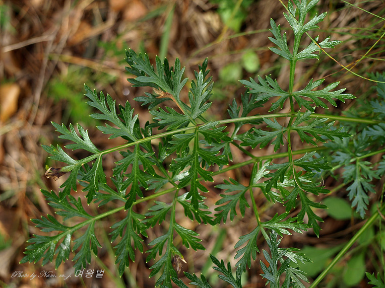최종 열편은 다시 몇 개의 짧은 선형 열편으로 갈라지거나 뾰족한 톱니 모양이며 위로 올라갈수록 잎이 작아져서 2회 우상으로 된다.