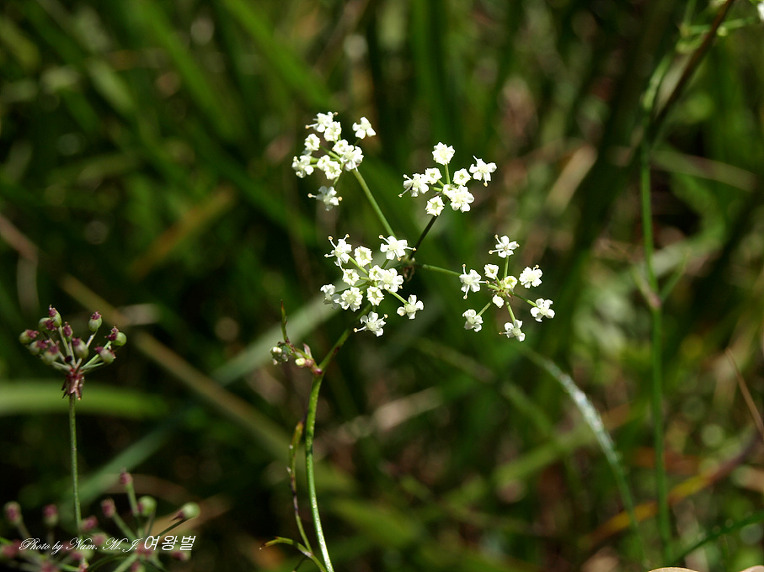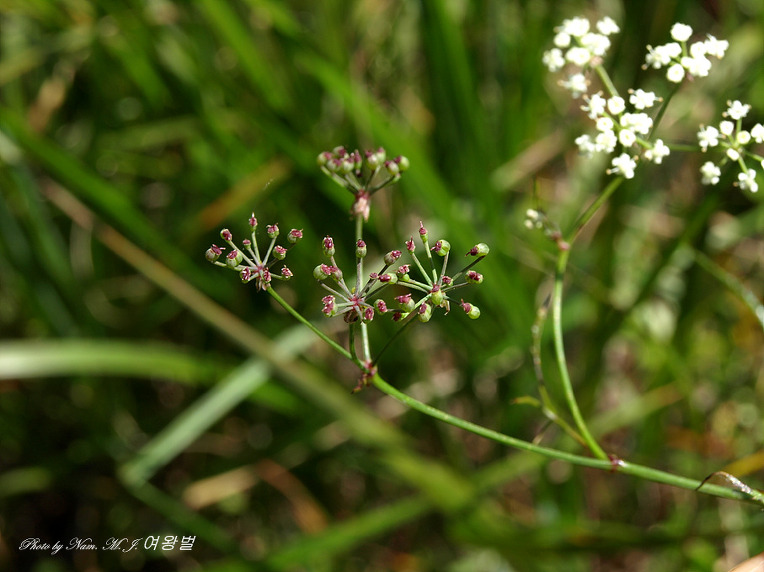 | 총포편과 소총포편은 피침형, 길이 2-4mm로서 가장자리가 백색이며 젖혀지고 소산경은 길이 2cm로서 10개 정도이며 10-20개의 백색꽃이 달리고 소화경은 길이 3-5mm이다. | 총포는 5-6개로서 선형이며 젖혀지고 10-20개의 소산경으로 갈라지며 각 10여 개의 꽃이 끝에 달린다. 소총포는 소화경보다 짧고 젖혀진다. | 총포는 선형이며 3-5장이다.줄기는 서는 것과 눕는 것이 있으며 높이는 40-100cm이고 줄기는 가운데가 비어 있다. | 총포는 5-6개, 10-20개의 소산경으로 갈라지며 각각 10여 개의 꽃이 끝에 달리고 꽃받침잎이 뚜렷하다. 소총포는 소화경보다 짧고 젖혀진다. |