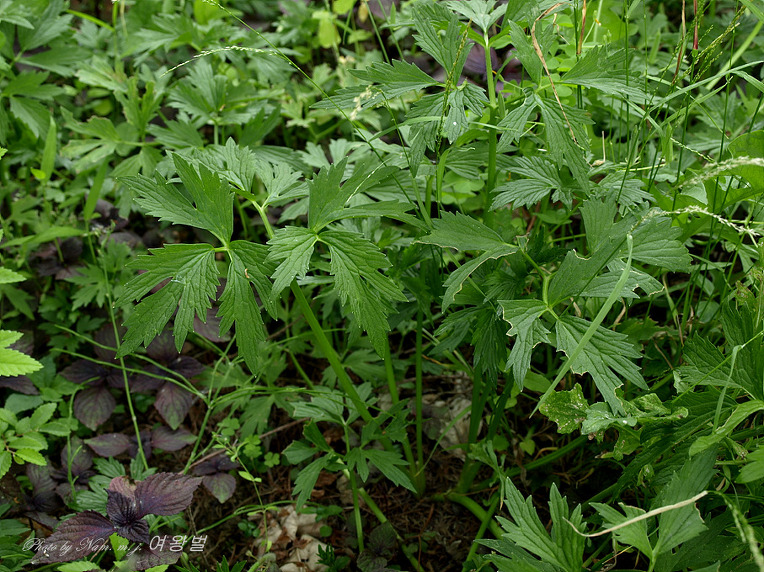 근생엽은 엽병이 길고 3출엽이며 소엽은 엽병이 있고 넓은 난형이며 길이와 폭이 각 4-8cm로서 2-3개가 완전히 갈라지고 있다. 열편은 끝이 뾰족하고 2-3개로 중렬하며 결각상의 톱니가 보인다. 잎자루에는 털이 안 보였다