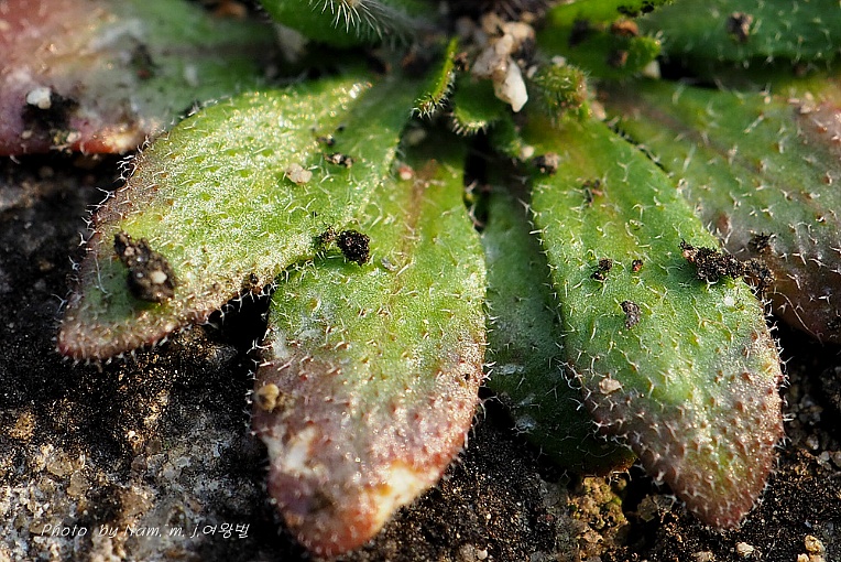 근생엽은 총생하고 꽃이 진 다음에도 남아 있으며 주걱모양이고 길이 5~33mm, 폭 2.5-7mm로서 불규칙한 톱니가 있으며 표면에 성모가 있다.