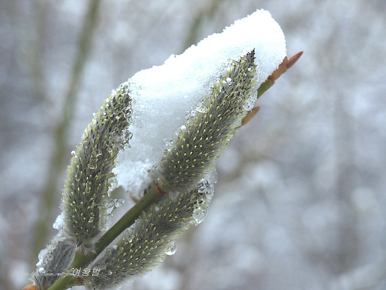 싸락눈이 아직도 내리는 강원도 산골짝에 버드나무가 눈을 뒤집에 쓰고 있다.