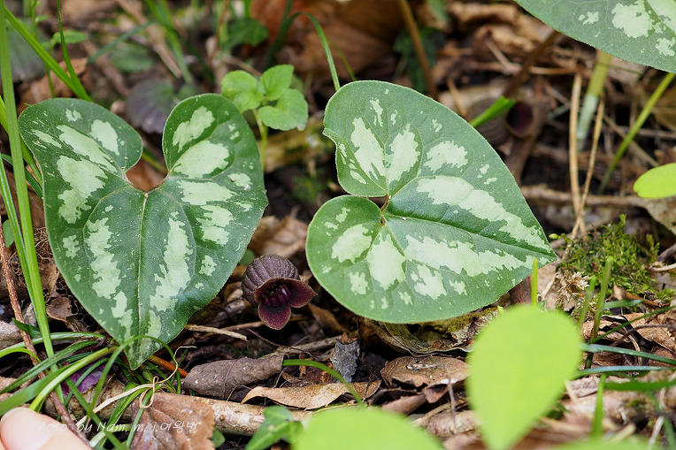 족도리풀에 비해 잎에 무늬가 있는데 제주에서 본 개족도리풀의 무늬보다는 연하고 잎이 얇았다.