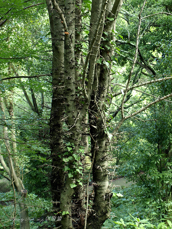 큰 줄기의 수피에는 날카로운 가시가 많이 있는데 이 가시는 가지가 가시화 된 것으로 나중에 가지로 성장한다