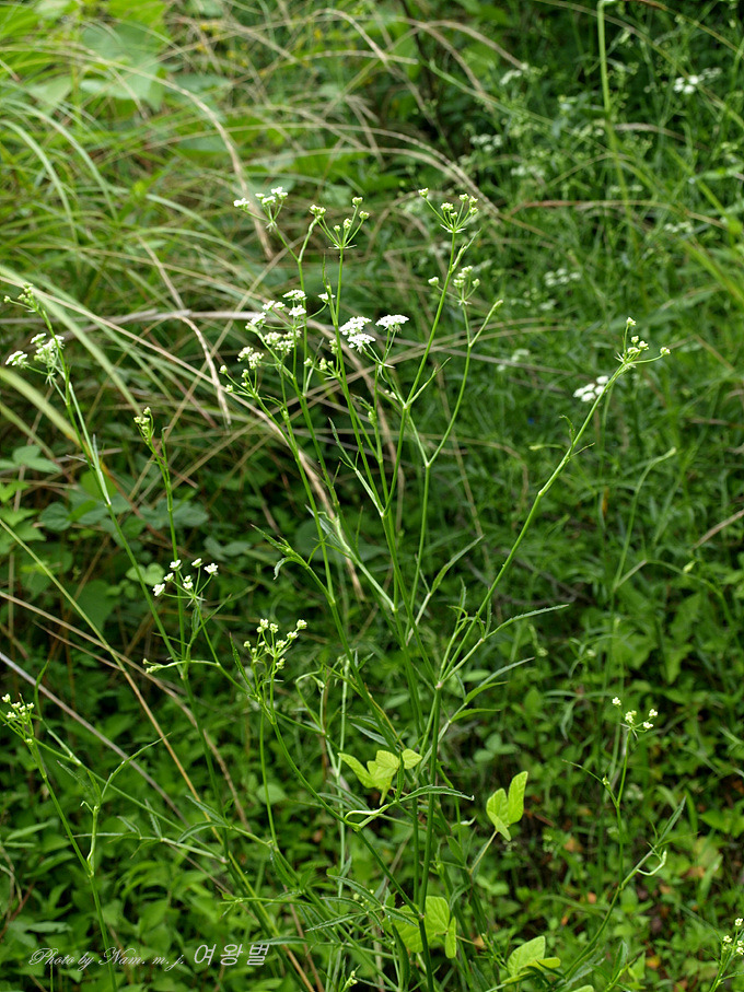 꽃은 겹산형화서로 달리고 산경은 길며 소산경은 길이 2cm로서 10개 정도이며 10-20개의 백색꽃이 달리고 소화경은 길이 3-5mm이다.