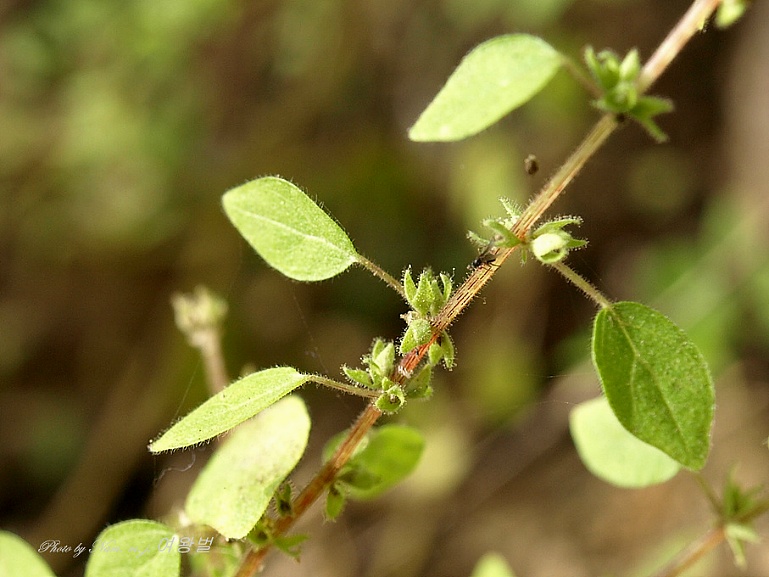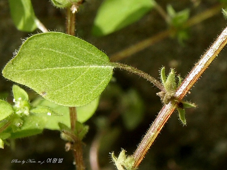잎끝이 둔하고 가장자리가 밋밋하고 2쌍의 측맥이 있으며 잎자루와 잎가장자리에 퍼진털이 있고 엽병은 긴 편이다
