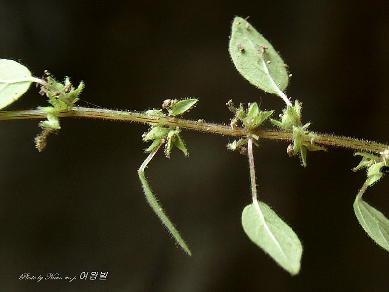 [꽃은 잡성으로 잎짬에 2~3개씩 녹색으로 피고 양성화와 수꽃 화피는 3~4개로 깊게 갈라진다. 포는 피침형으로 선모가 있다]