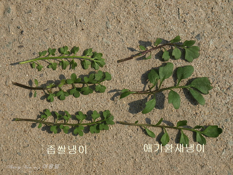좁쌀냉이는 소엽이 세갈래로 깊게 결각이 져 있고 소엽의 크기가 일정하다.