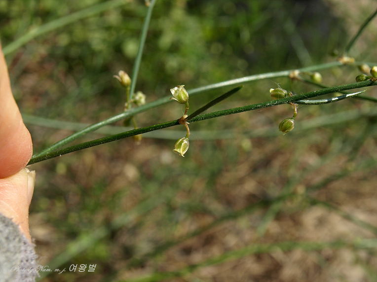 인편상의 잎 겨드랑이에서 꽃이 달려 있고 선형의 엽상지는 엉성하게 달려 있다.