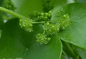 잎은 방패모양의 넓은 난형이고 가장자리가 밋밋하며 뒷면은 흰빛이 돈다. 엽병은 길이 3-12㎝이다.