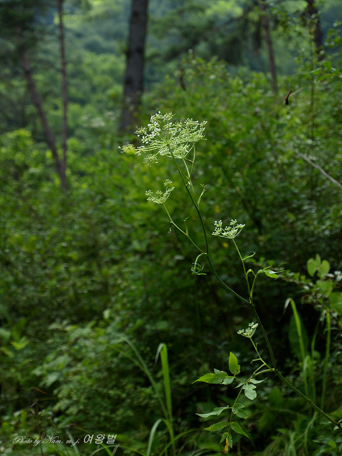 꽃은 백색으로 7~8월에 피며 복산형화서에 달리고 산경에 능선이 있으며 윗부분에 밀모가 있고