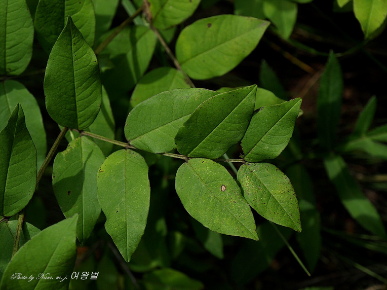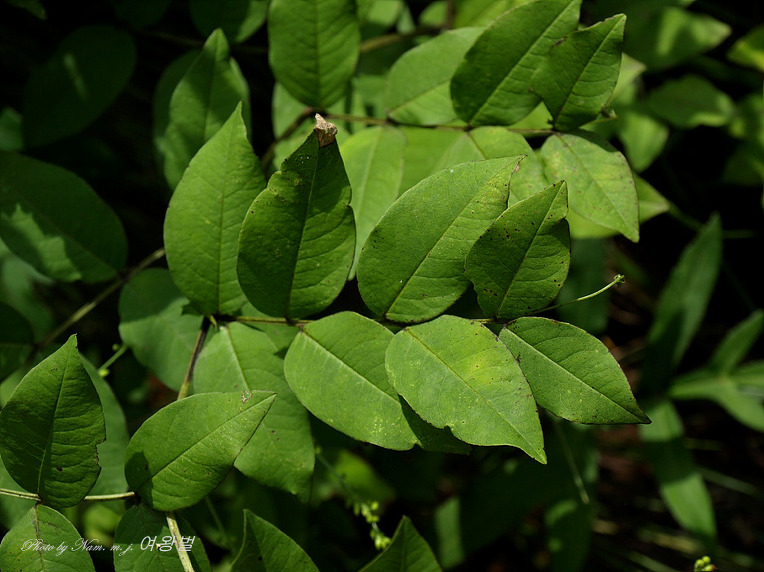 화서가 발달한 위쪽으로 가면 2~3개로 갈라진 덩굴손이발달하고 2장의 잎이 마주나서 마치나비나물 처럼 보이기도 한다