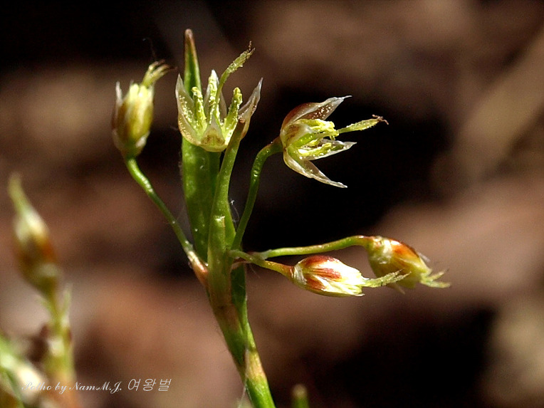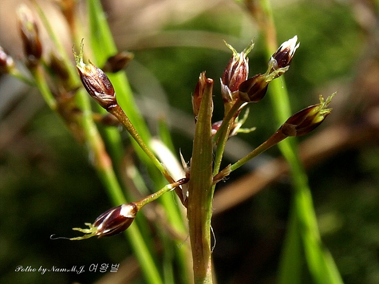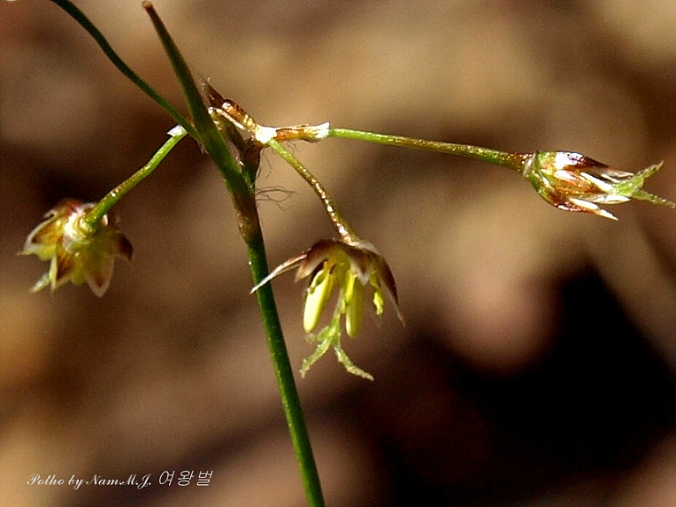 줄기 끝에 3~5개의 꽃으로 된 두화가 산형으로 달리며 포는 화서보다 길거나 짧다 화피편은 피침형으로 2~2.5cm, 내외편 길이 같음 화피와 삭과가 황갈색 또는 녹갈색으로 꽃밥과 수술대의 길이가 같다 |