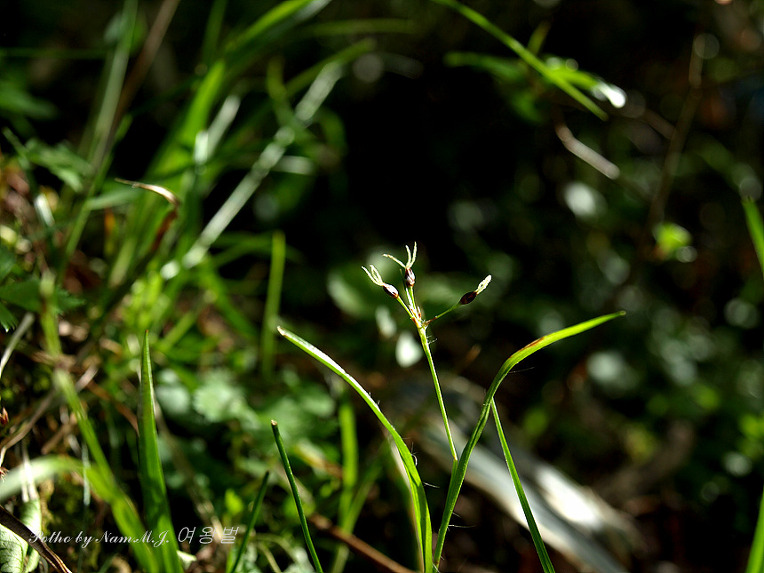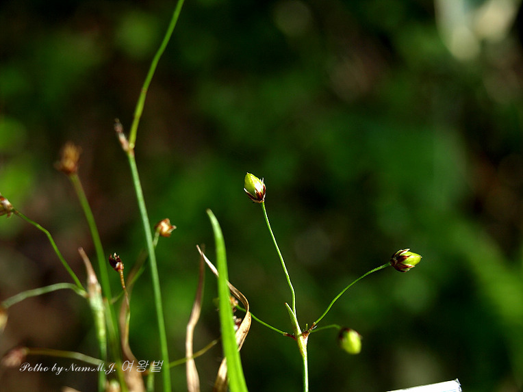 줄기 끝에 3~5개의 꽃으로 된 두화가 산형으로 달리며 포는 화서보다 길거나 짧다 화피편은 피침형으로 2~2.5cm, 내외편 길이 같음 화피와 삭과가 황갈색 또는 녹갈색으로 꽃밥과 수술대의 길이가 같다 |