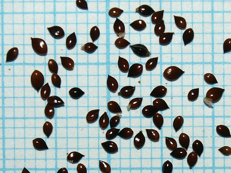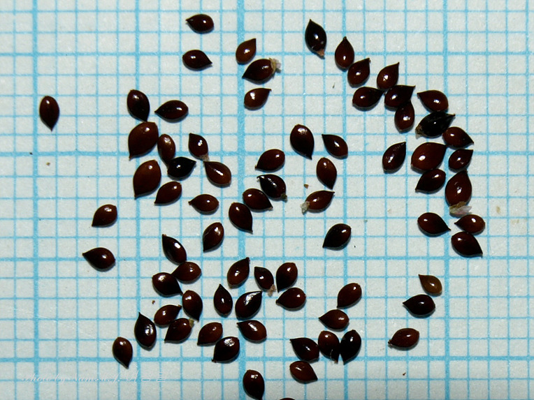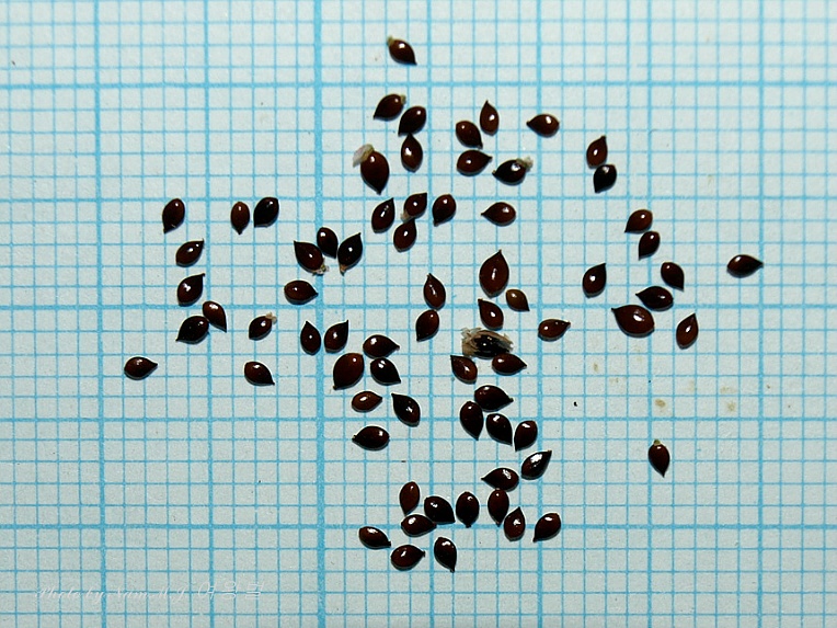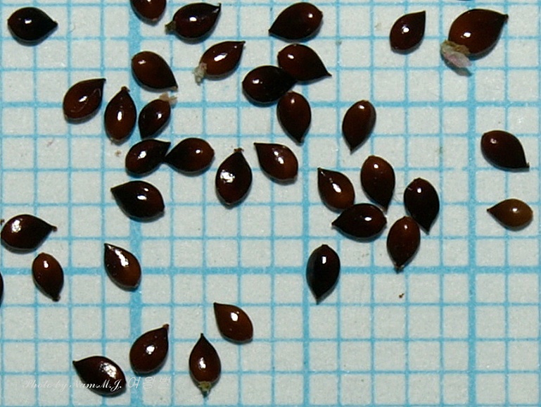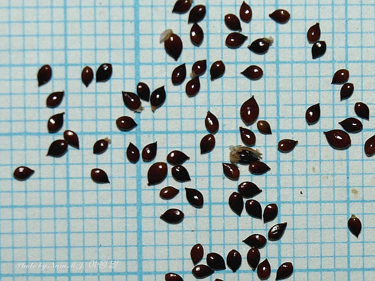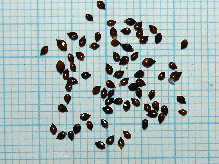 광택이 있고 납작한 편구형이며 종자 크기가 아주 작다.