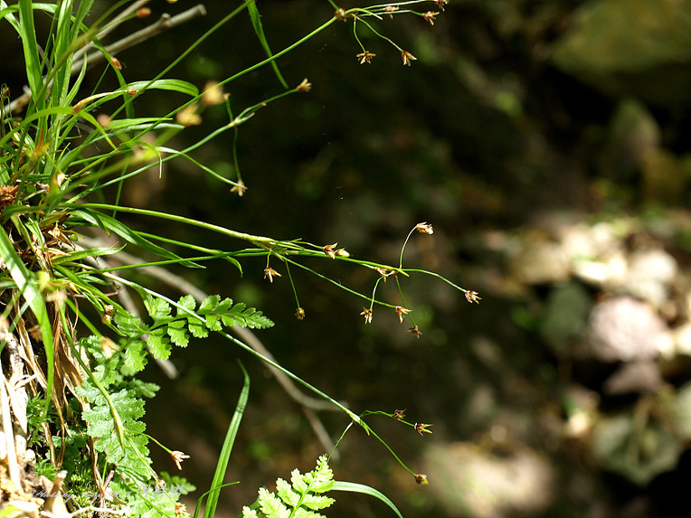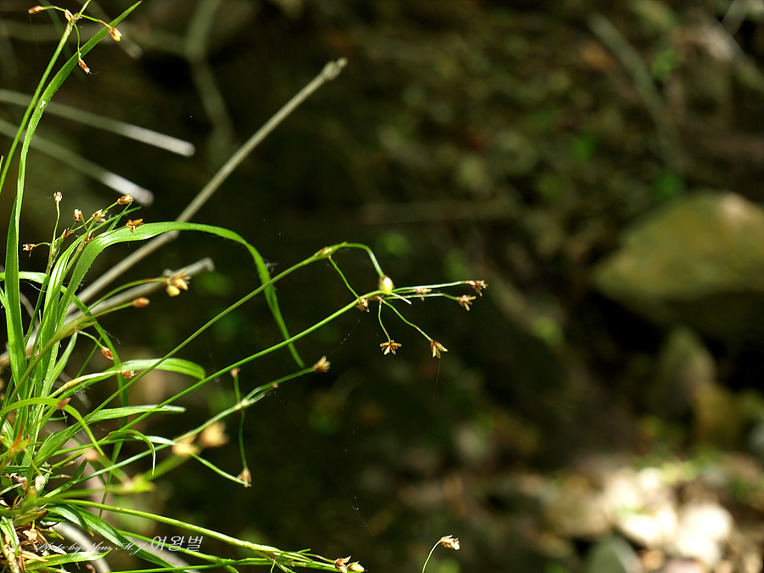 | 줄기 끝에 1개의 두화(드물게 2~3개)가 달리고 하위 포는 화서 보다 길다.삭과 열매는 흑갈색으로 화피와 길이가 거의 비슷하고 화피편은 넓은 피침형 산새밥에 비하여 두화가 대형으로 꽃밥이 수술대 보다 몹시 길다 |
