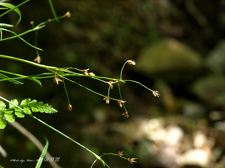 줄기 끝에 3~5개의 꽃으로 된 두화가 산형으로 달리며 포는 화서보다 길거나 짧다 화피편은 피침형으로 2~2.5cm, 내외편 길이 같음 화피와 삭과가 황갈색 또는 녹갈색으로 꽃밥과 수술대의 길이가 같다 |