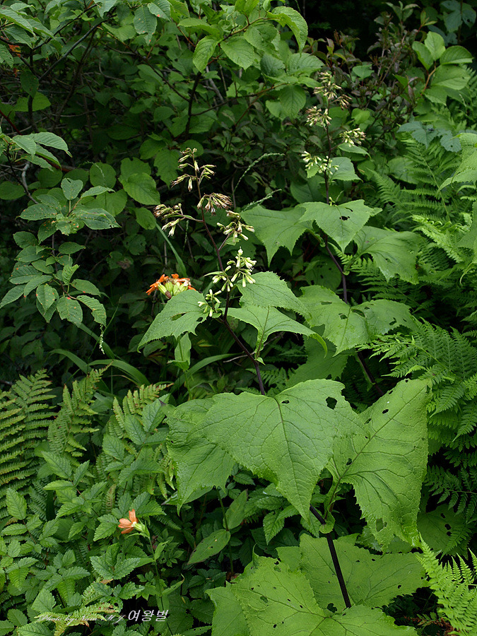강원도 숲에서 흔하게 보이는게 나래박쥐나물로 잎자루에 날개가 있고 아래가 귀모양으로 발달하여 줄기를 감싼다.