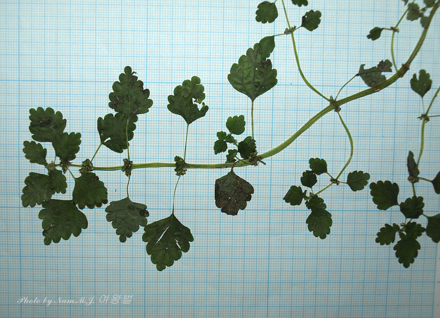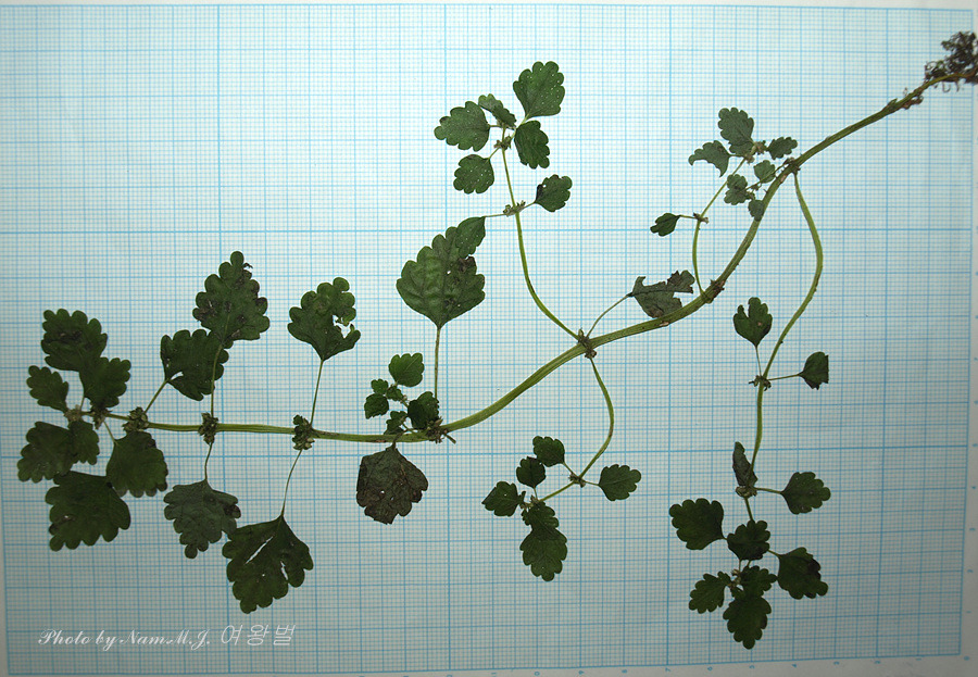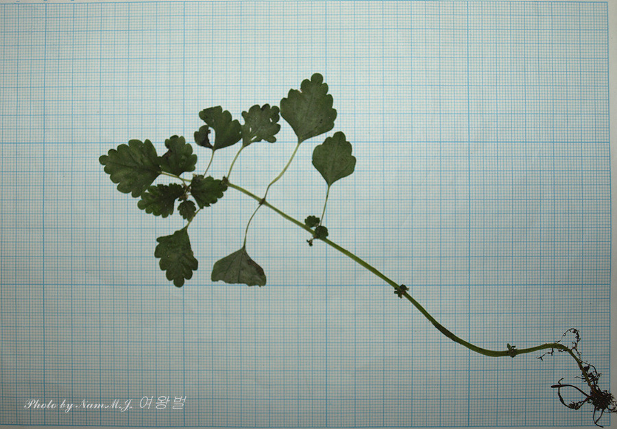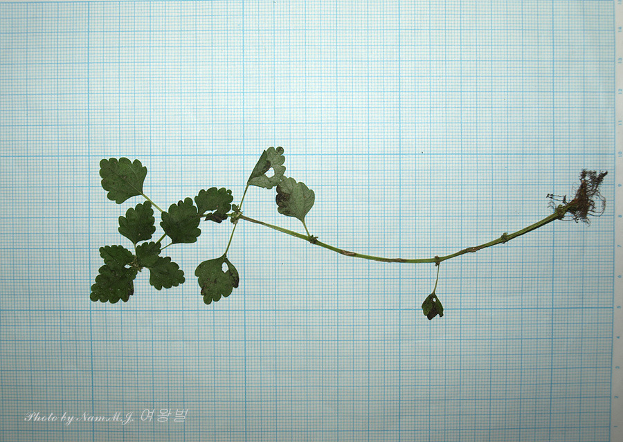 초장이 10cm 정도로 작은 녀석으로 긴 잎자루 끝에 3개의 맥을 가지며 둥근톱니가 3~4쌍 인 잎을 가지고 있다.
