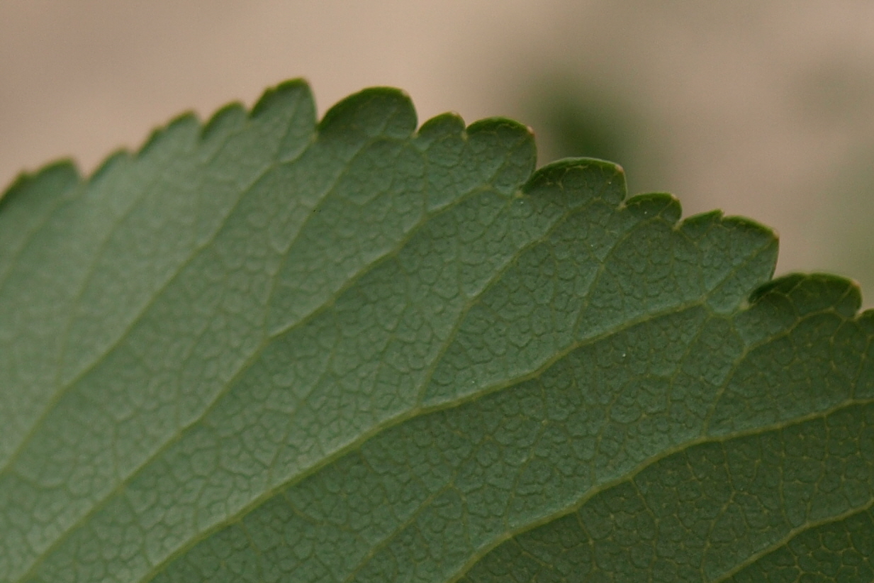 잎은 난형 또는 난상 타원형, 잎 표면이 비교적 매끈, 잎가장자리가 말리고 고르지 않은 거친 톱니가 있다.