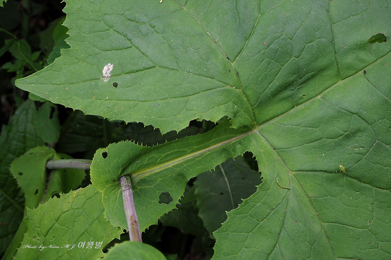 잎자루 날개와 귀에 톱니가 있고 소화 수가 10개 정도, 총포편이 5-6개