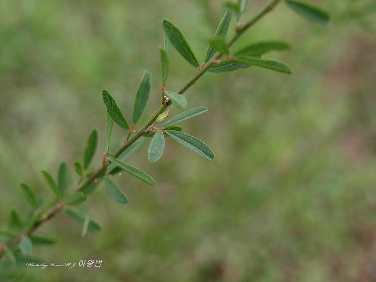 길이 1.5~3.0cm, 너비 5~10mm 잎자루 10-20mm 선상 긴타원형, 비수리보다 잎이 넓고 측맥 사이 그물맥 뚜렷하다 |