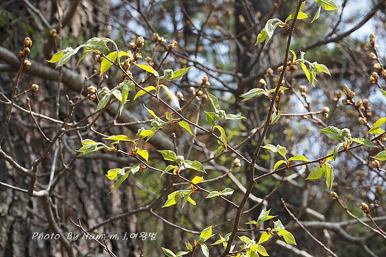 윤노리나무 새순이 분녹색으로 뽀얗게 돋아나고 꽃봉오리도 밀어내고 있다