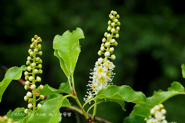 화서는 귀룽나무나 세로티나벚나무처럼 길다란 총상모양꽃차례로 새끼손가락 길이 정도였다.