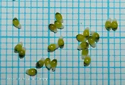 타원형의 종자 표면에 자잘한 돌기가 있고 가운데 길게 능각이 도드라져 있다