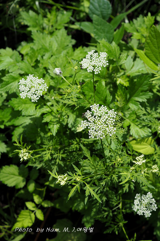 | 잎은 어긋나며 3회 깃꼴겹잎이다. 최종 갈래는 선형이고 가장자리는 뒤로 말려 두꺼워지고 짙은 녹색이며 끝이 뾰족하다. 잎자루는 밑부분이 넓어져 원줄기를 감싸고 위로 가면 밑부분이 잎집으로 된다. 꽃은 6~7월에 피는데 흰색이고 겹산형꽃차례에 달리며, 작은산형꽃차례는 20개 쯤이다. 총포편은 6-10장, 소총포편은 5-9장, 선형 내지 선상 피침형이며, 가장자리는 흰색이며 막질이다. 열매는 분과이며 타원형 또는 날개 모양이며 7~8월에 익는데 흰색으로 능선이 10개 있다. |
