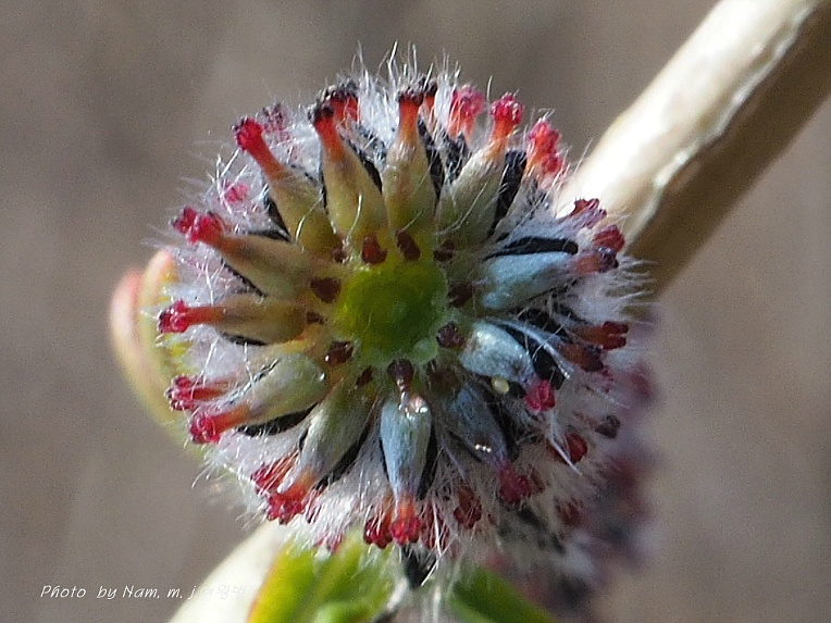 키버들은 암술이 붉고 검은색의 포를 가지고 있어서 꽃차례 전체가 검붉은색이 난다.