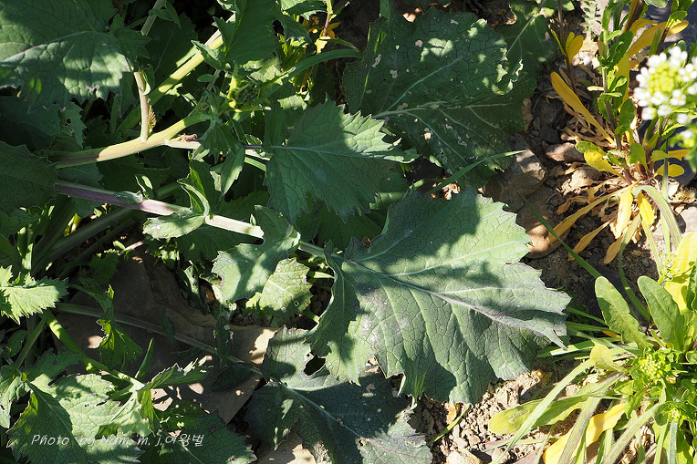 유채의 줄기 잎은 기부가 줄기를 감싸는데 갓은 줄기를 감싸지 않는다.