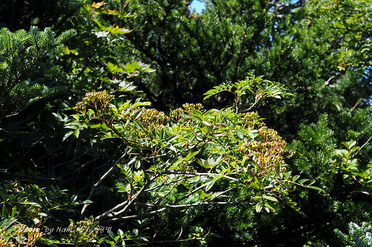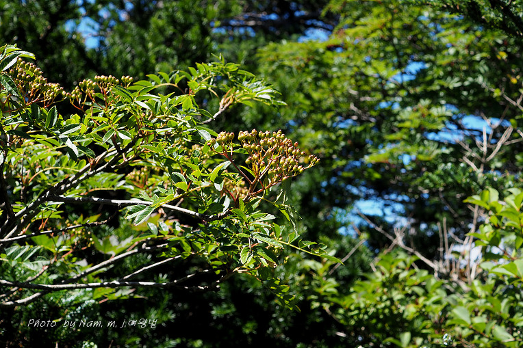 제주도 윗세오름을 오르다 만나는 이 녀석은 잎과 화서, 동아에 털이 전혀 없는 뺀질이 마가목이다.