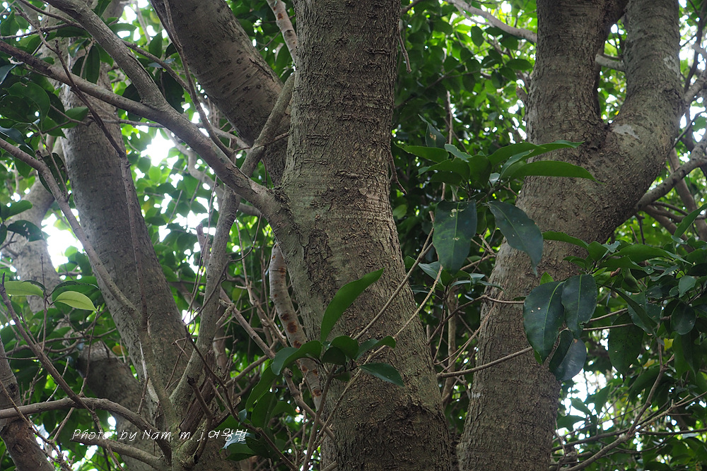높이 10~15m의 상록 큰키나무로 가지는 회색이며 어린 가지는 납작하다.