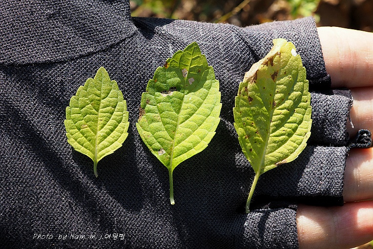 | 털들깨 | 포는 결실기까지 남아 있으며 가장자리에 긴털이 있음 | 화경이 짧다 | 잎 표면, 잎자루에 긴털이 있다. 밑부분 심장상 원형, 편평형, |