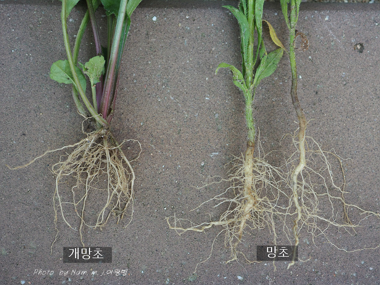 개망초는 원뿌리가 없는 수염뿌리. 망초는 원뿌리가 길게 자라는 형태이다.