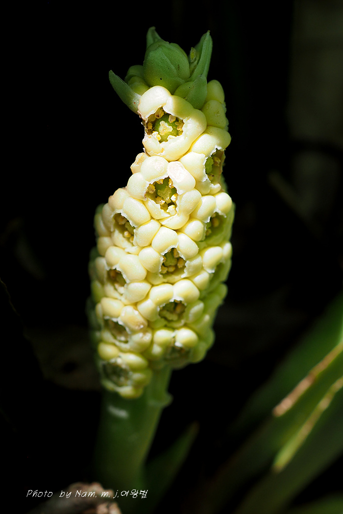 연노랑꽃이 이삭꽃차례로 달리며, 수술은 6개, 수술대는 매우 짧다.