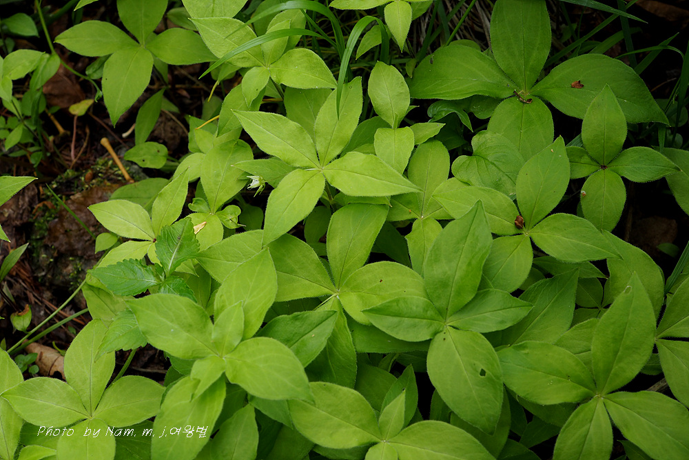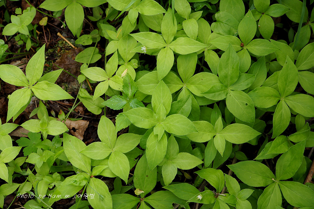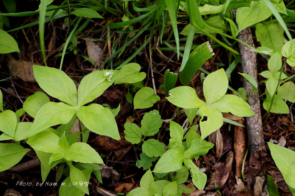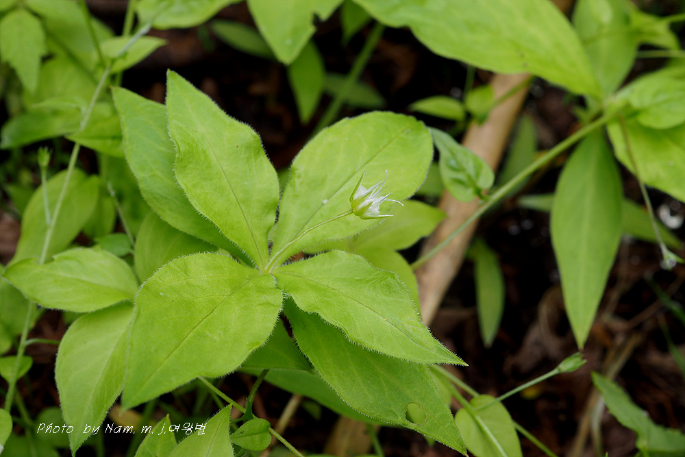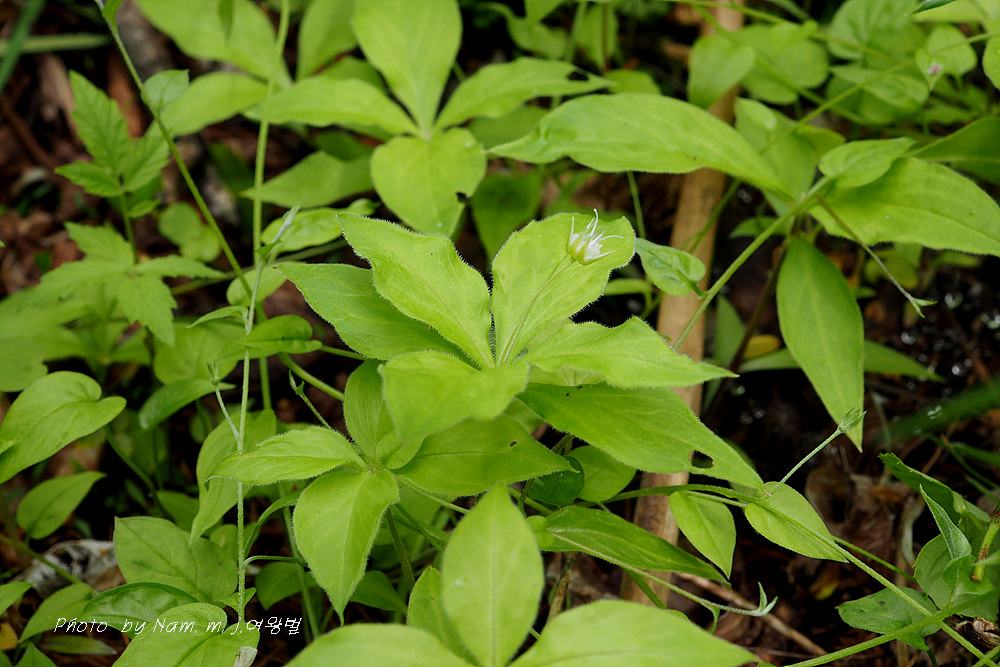 줄기 끝의 넉장의 잎이 엄청 커져서 개별꽃처럼 보인다.