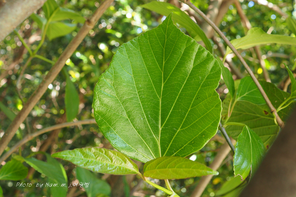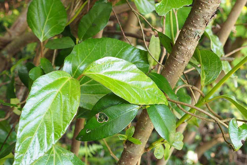 상록수라서 가죽질의 잎 표면은 광택이 있으며 양면에 털이 없고 잎 뒷면에 미세한 샘점이 빽빽하게 보였다.