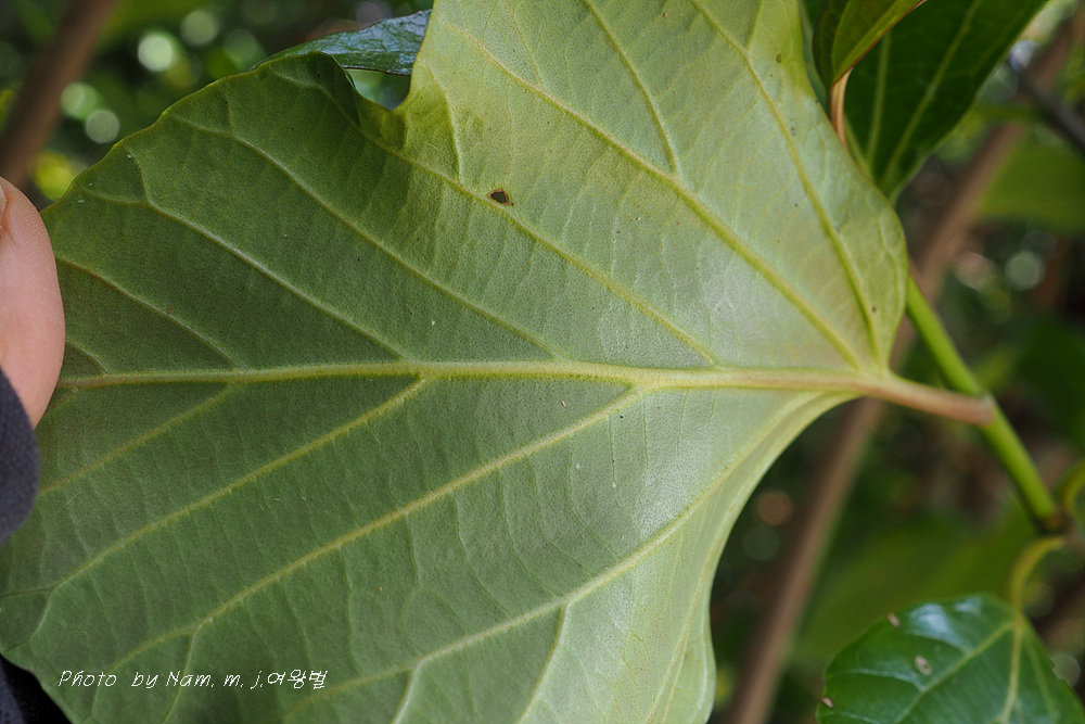 잎은 마주나며, 길이 5~20cm의 마름모꼴 난형 내지 마름모꼴 도란형으로