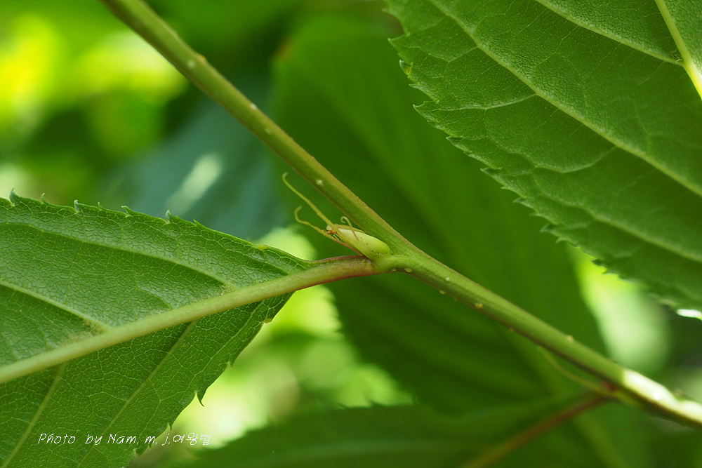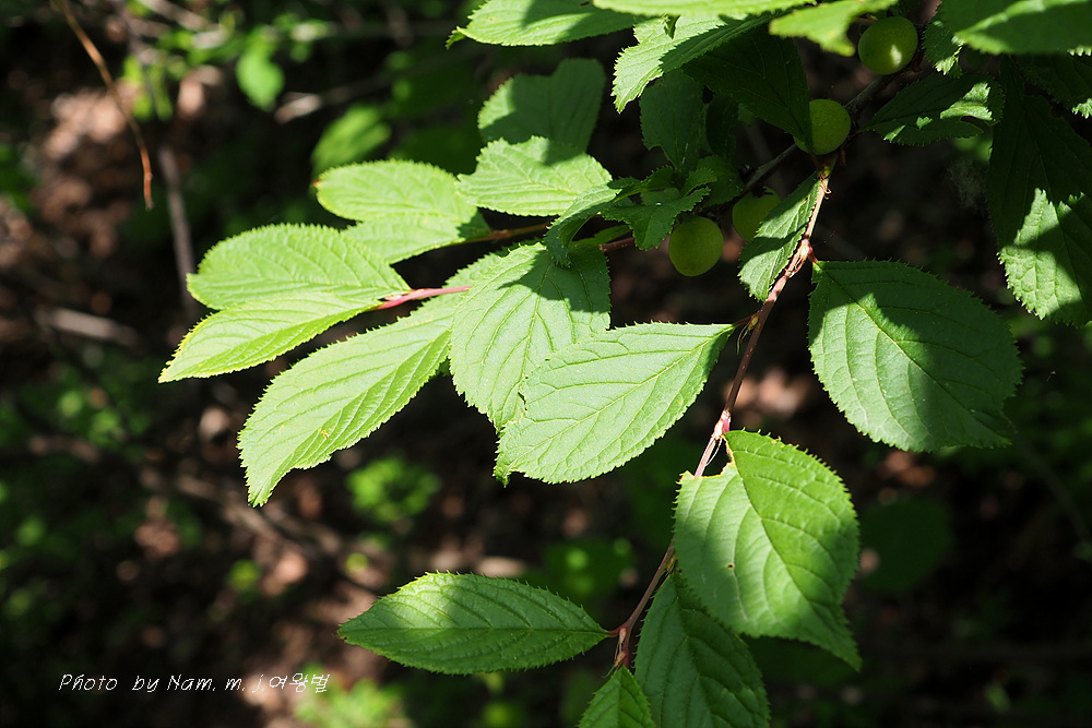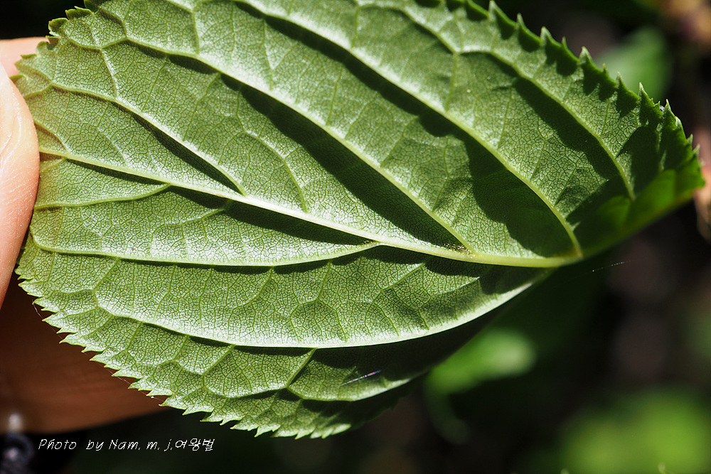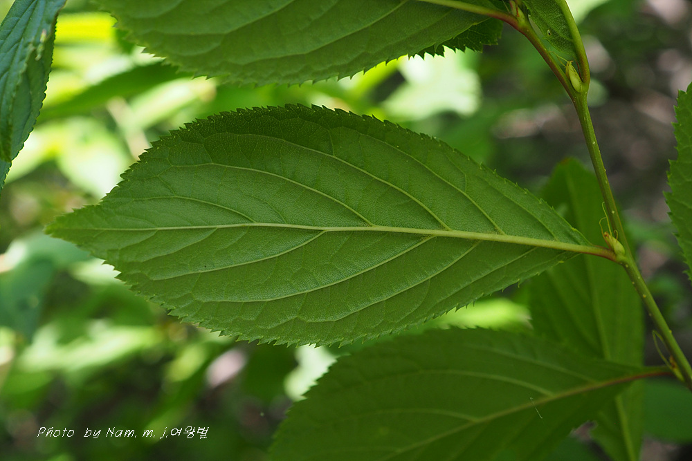 잎밑은 뾰족하고, 잎 가장자리는 잔거치가 있으며, 잎끝은 뾰족하다