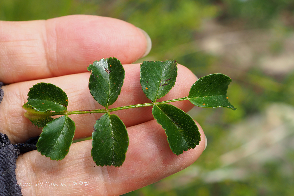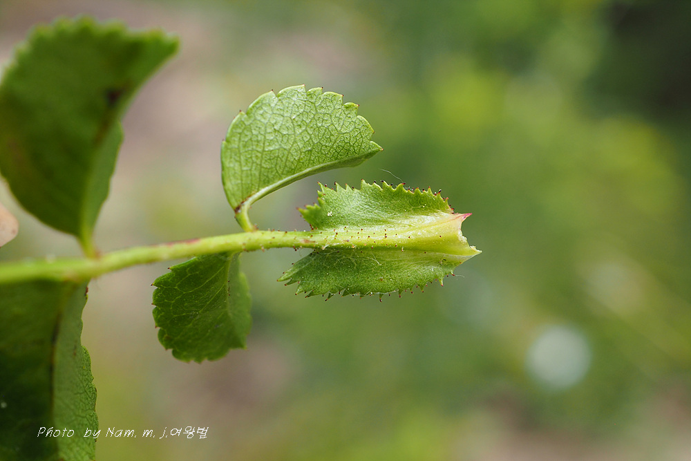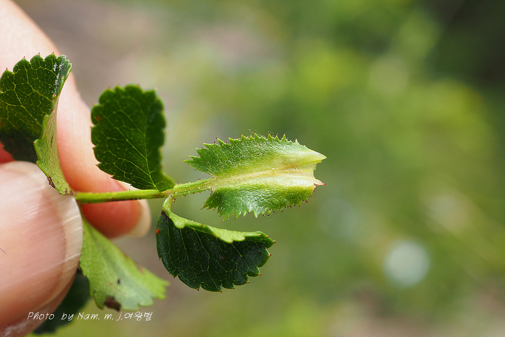 탁엽은 잎자루에 합착되어 있고 불규칙한 자잘한 톱니가 있다