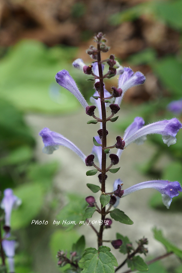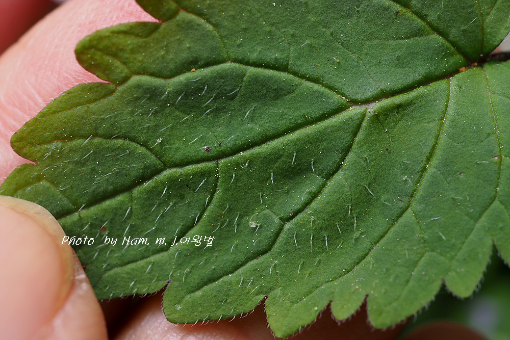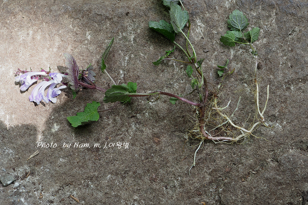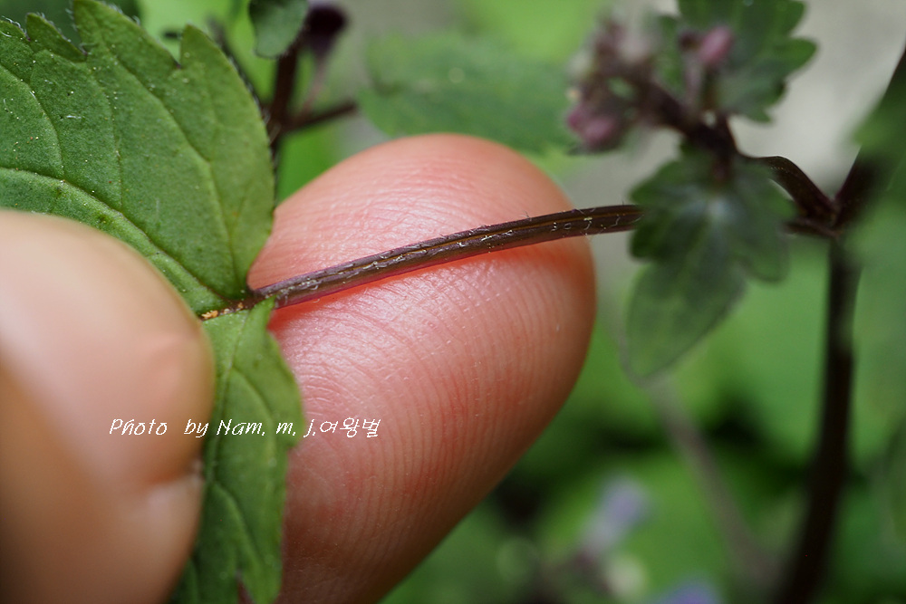 줄기 단면은 사각형이며, 전체에 털이 거의 없고, 마디에 위로 구부러진 흰 털이 있다.