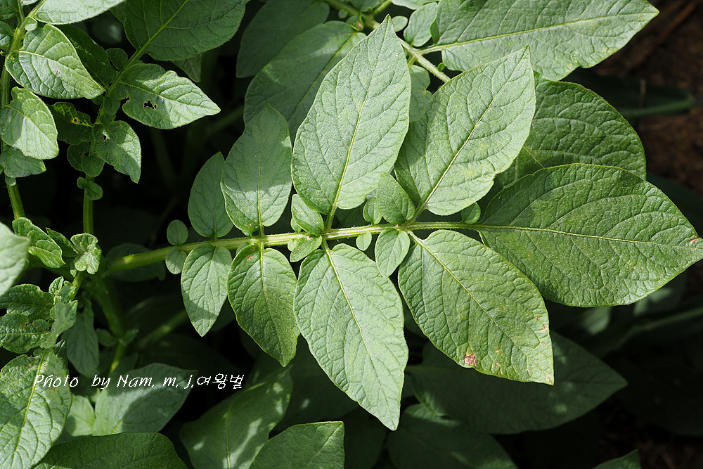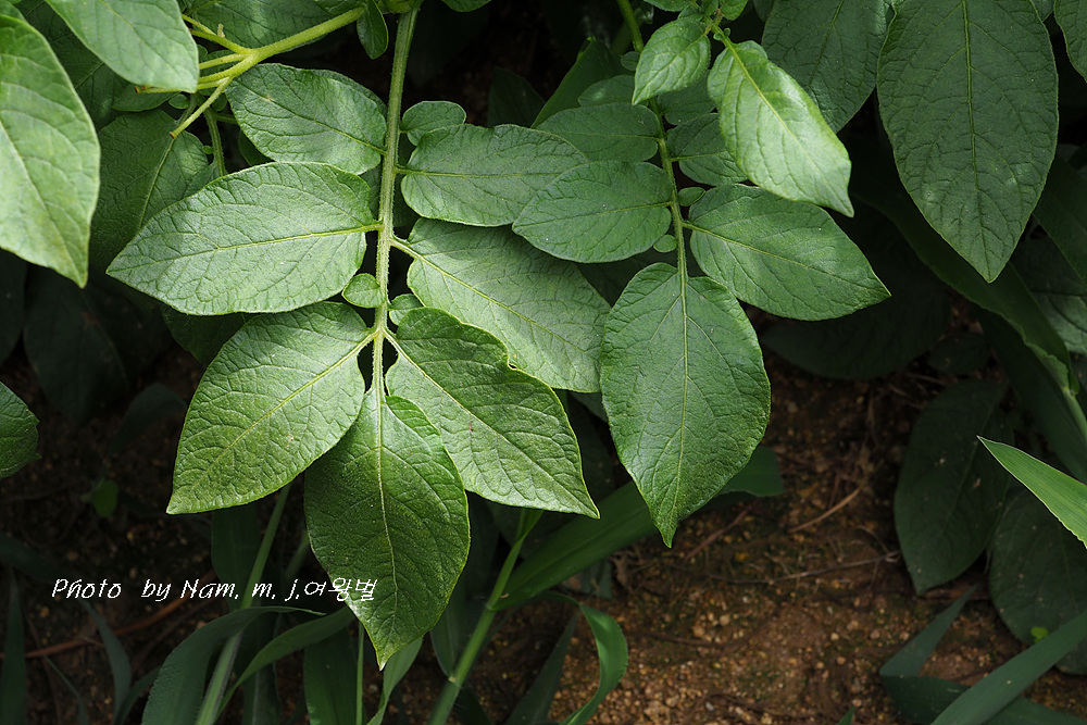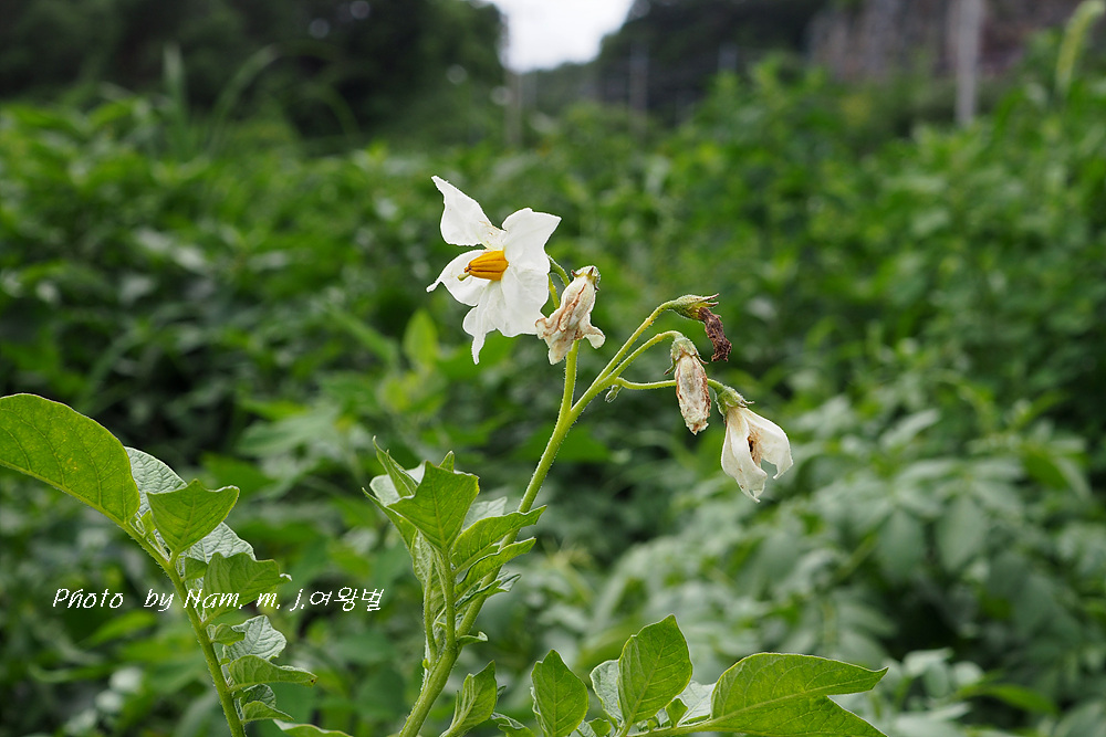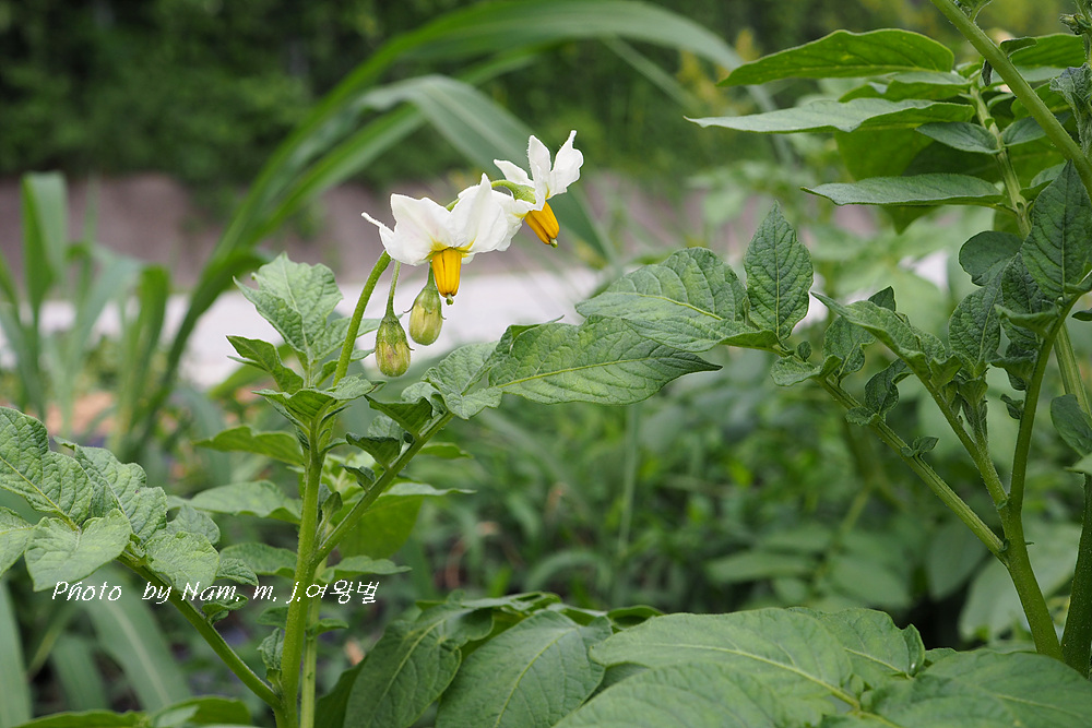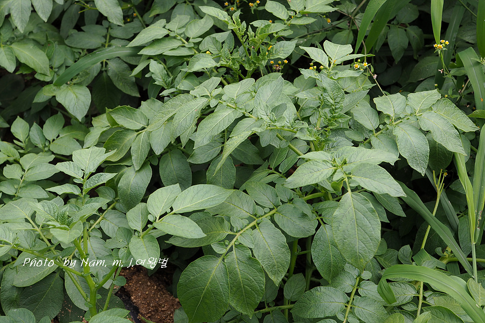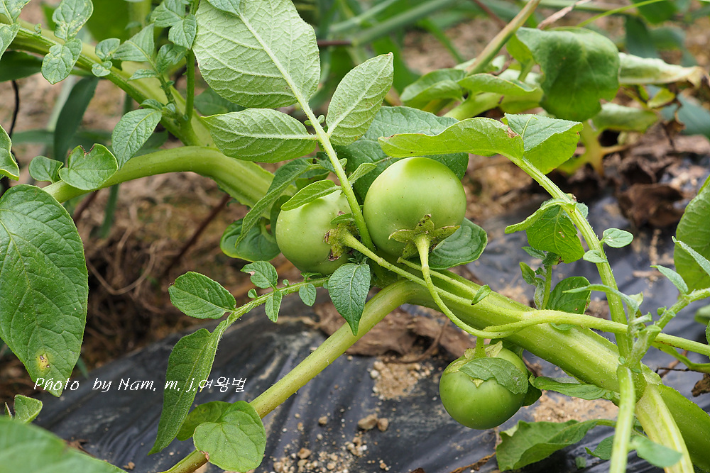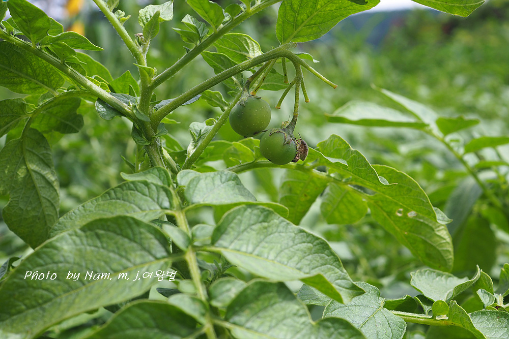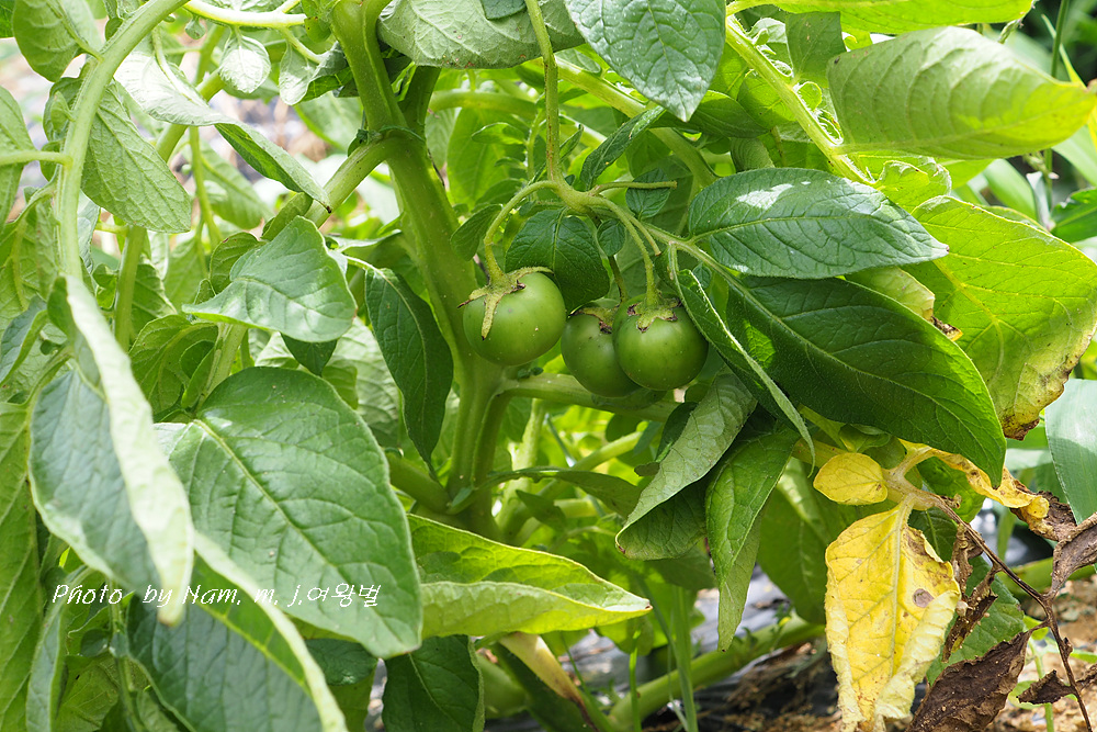 꽃이 핀 감자 줄기에 열매가 달린 게 보인다.