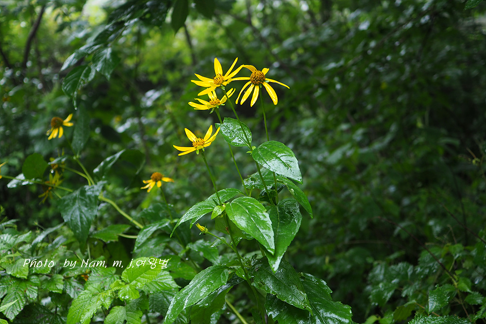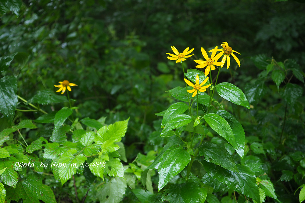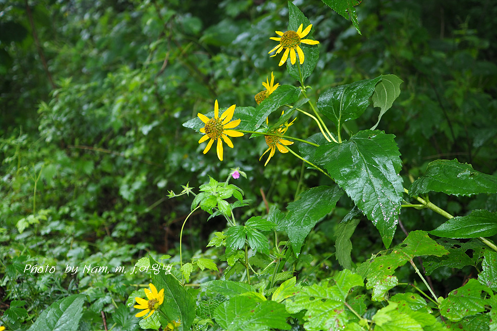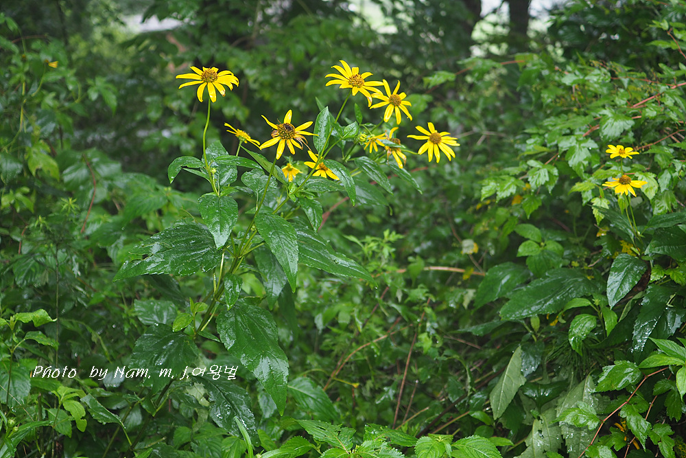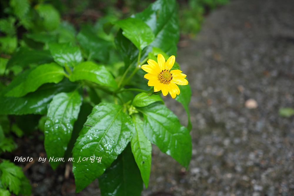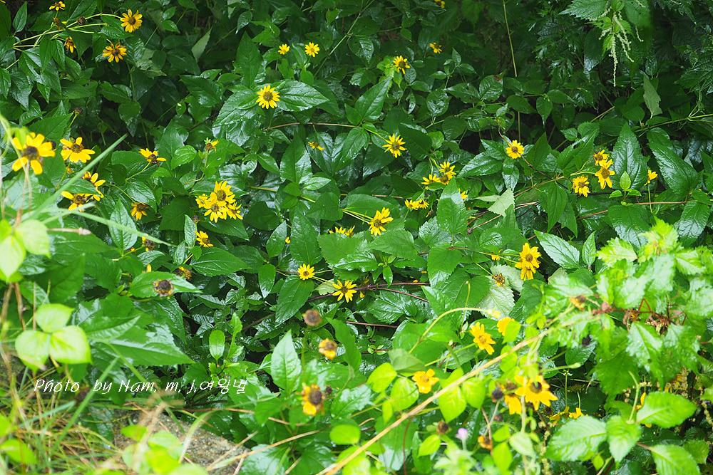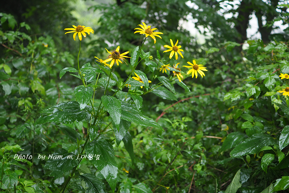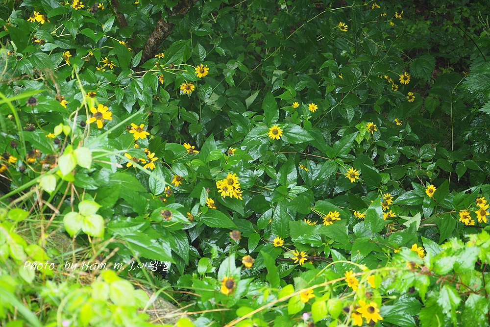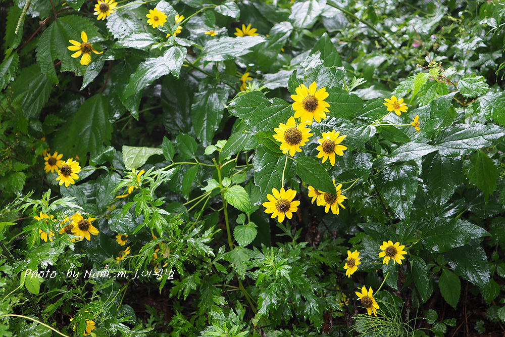 고개마루를 오르는 중간에 하늘바라기가 비에 젖어 있다.