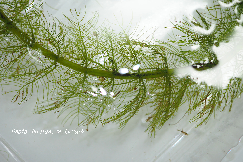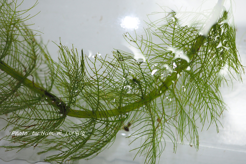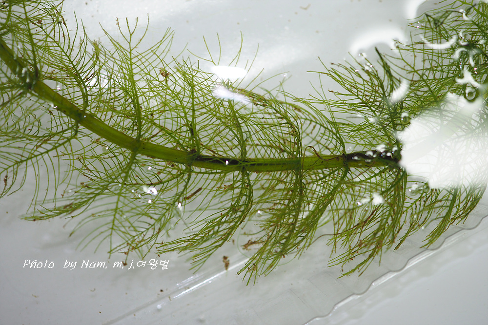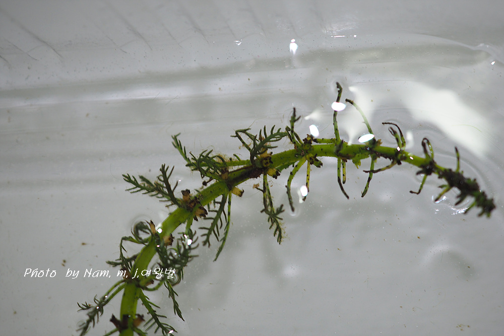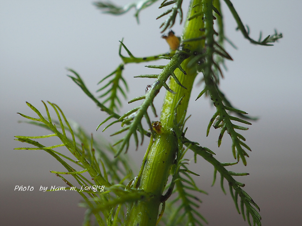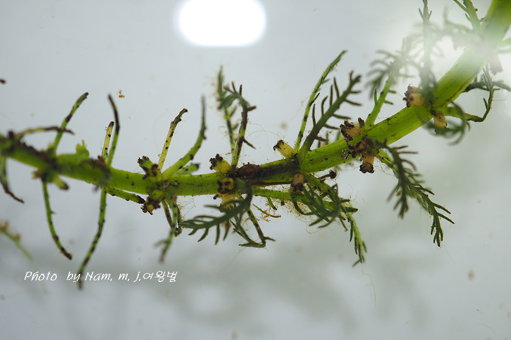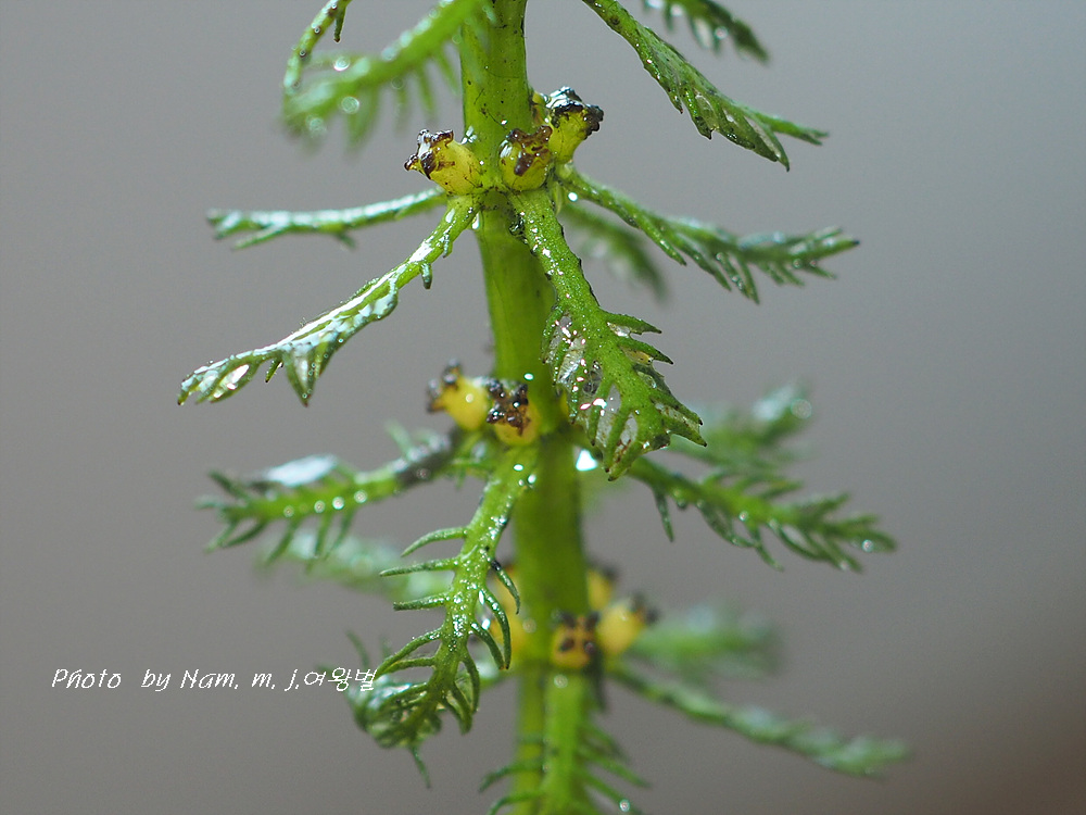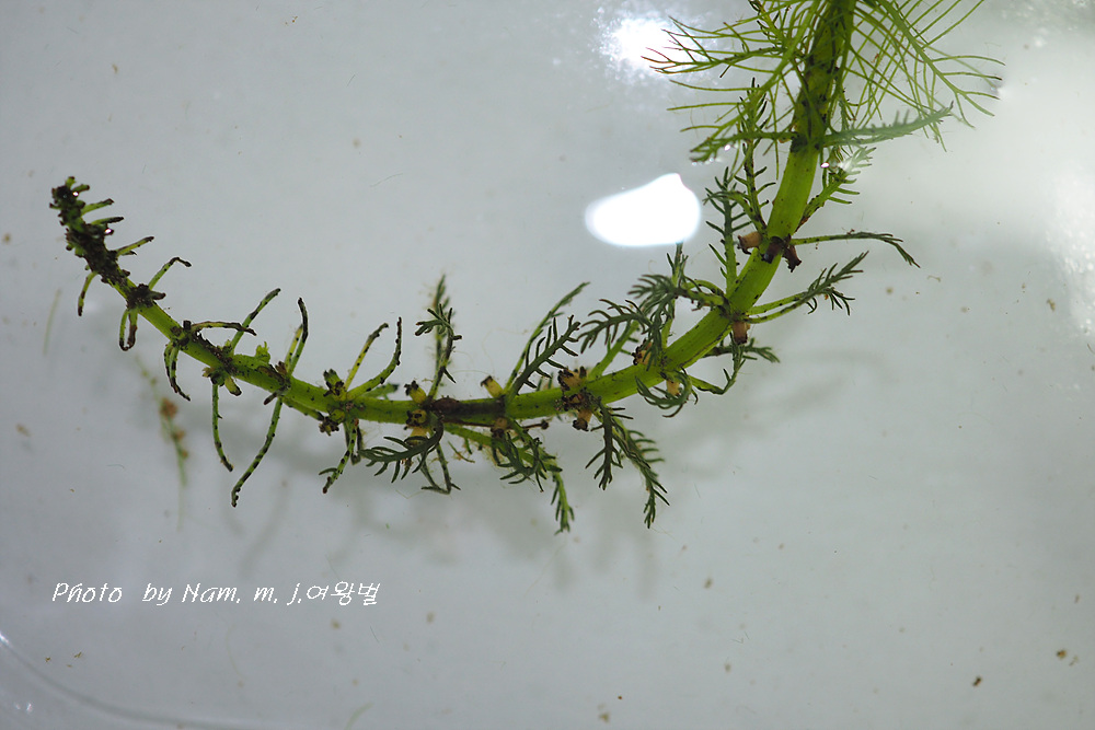 수중엽은 줄기의 마디마다 4장씩 돌려나며, 깃털 모양으로 깊게 갈라진다.