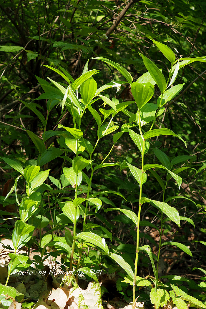 애기나리에 비해서 줄기는 많이 갈라지고, 화피는 녹색을 띠는 흰색, 크며, 수술의 3배 쯤 된다.
